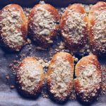 6. Wyrośnięte jagodzianki smarujemy roztrzepanym jajkiem z mlekiem. Następnie obficie posypujemy kruszonką.