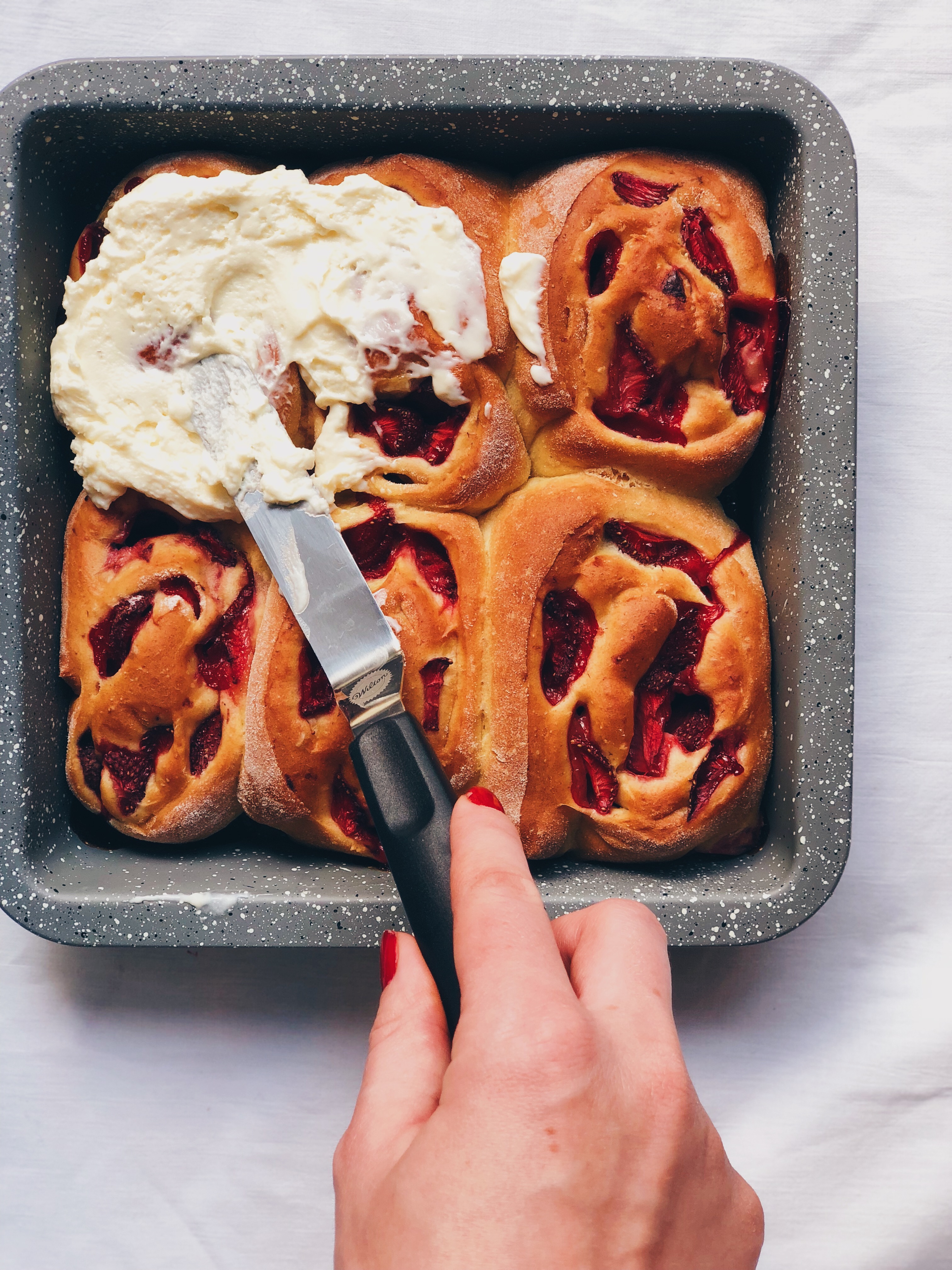 Nakładamy krem na ostudzone bułeczki. Pamiętajcie! Na gorących krem się rozpłynie 😉